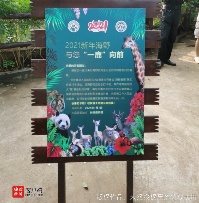 同时元旦当天入园游客在自己的抖音账号发布海南热带野生动植园坡鹿相关作品并@#海南热带野生动植物园#或#海野国宝坡鹿#话题,将发布作品出示给现场工作人员即可在游客中心区领取元旦纪念礼品一份。